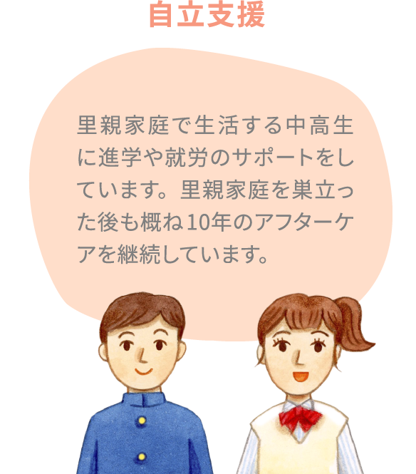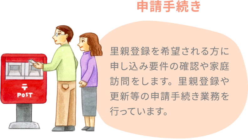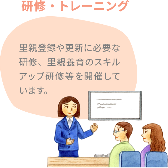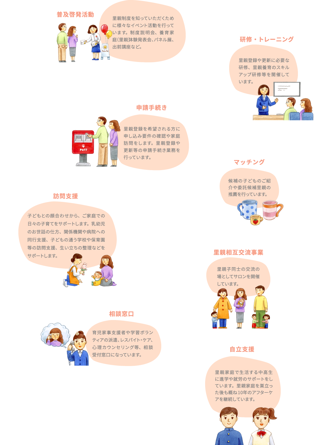 フォスタリング機関とは、里親制度を知っていただくための普及啓発活動から子どもが巣立った後のアフターケアまで、里親家庭とそこで生活する子どもへ一貫した包括的な支援を行う機関です。里親家庭に対して児童相談所や関係機関と連携しながら様々なサポートを行っています。