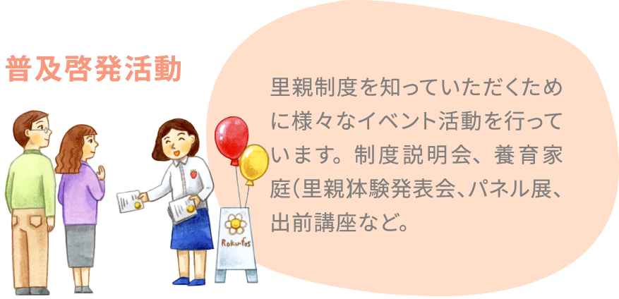 私たちフォスタリング機関六踏園は、品川区にお住まいの方に里親制度を知っていただくための普及啓発活動から子どもが巣立った後のアフターケアまで、里親家庭とそこで生活する子どもへ地域密着型のお手伝いをさせていただいています。品川区内のお祭りに参加して普及啓発をおこなったり、里親さんと一緒に子どもの保育園を探したり、里親さんにとって身近な頼れる人を目指しています。私たちは”チーム里親”として、里親さんと伴走していきます。