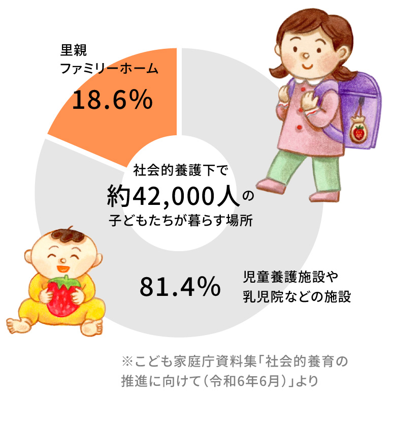 少子化が懸念されている日本の中で、これからの未来を担う大勢の子どもたちが、親の健康・経済面での理由や、両親の離婚や入院、虐待などにより親元で健全に過ごすことのできない現実があります。